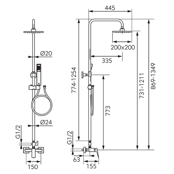 klizna metalna šipka s podesivom duljinom, 774 - 1254 mm